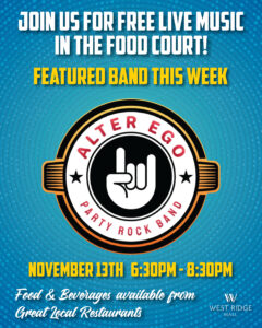 Featuring Alter Ego- Local band covering country, RNB, Rock and Pop Classics! FREE concert in the West Ridge Mall Food Court.