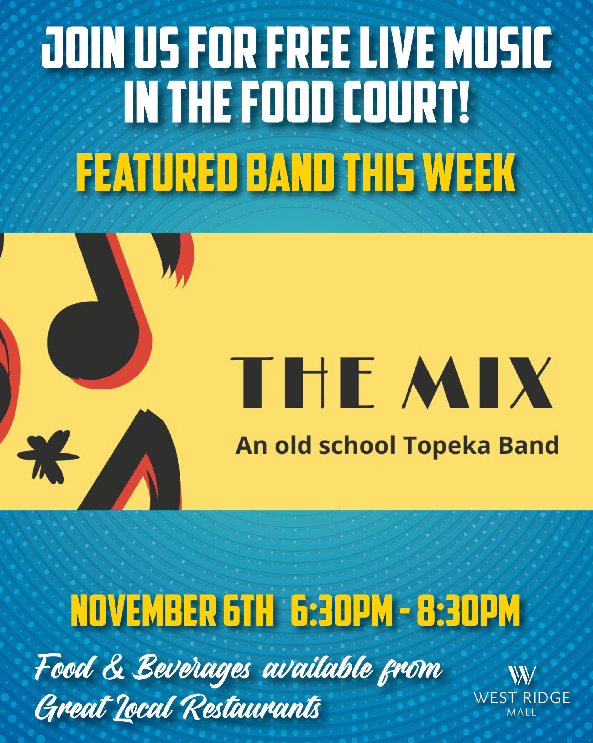 Featuring The Mix- An Old School Topeka Band. FREE concert in the West Ridge Mall Food Court.